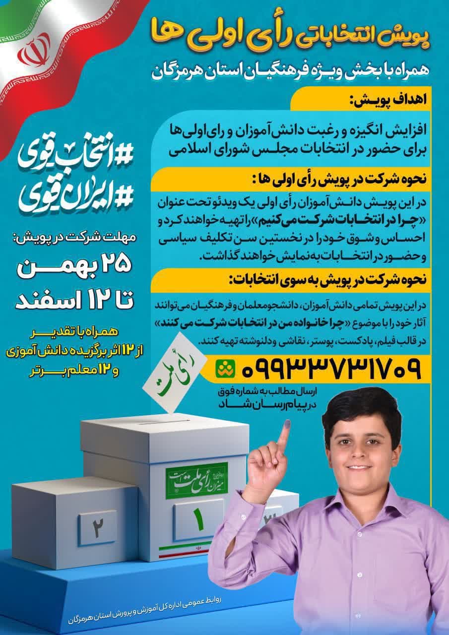 مدیرکل آموزش و پرورش استان هرمزگان در ادامه به اجرای پویش ” به سوی انتخابات” ویژه دانشآموزان خبر داد و گفت: در این پویش تمام دانشآموزان استان میتوانند آثار خود را با موضوع “چرا خانواده من در انتخابات شرکت می کنند” را در قالب فیلم، پادکست، پوستر، نقاشی و دلنوشته تهیه کنند و به شماره ۰۹۹۳۳۷۳۱۷۰۹ در پیام رسان شاد ارسال کنند.