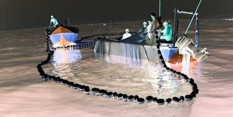در این صید مخرب که تور ماهیگیری در دریا پهن میشود و با نورافکن، نور شدید در دریا منعکس شده، باعث تجمع ماهیان ریز و درشت در اطراف شناور میشود؛ پس از آن نیز شناور دوم با بهرهگیری از تور پرساین محاصرهای تمامی ماهیهای جمع شده را در زیر نور جمعآوری میکند.