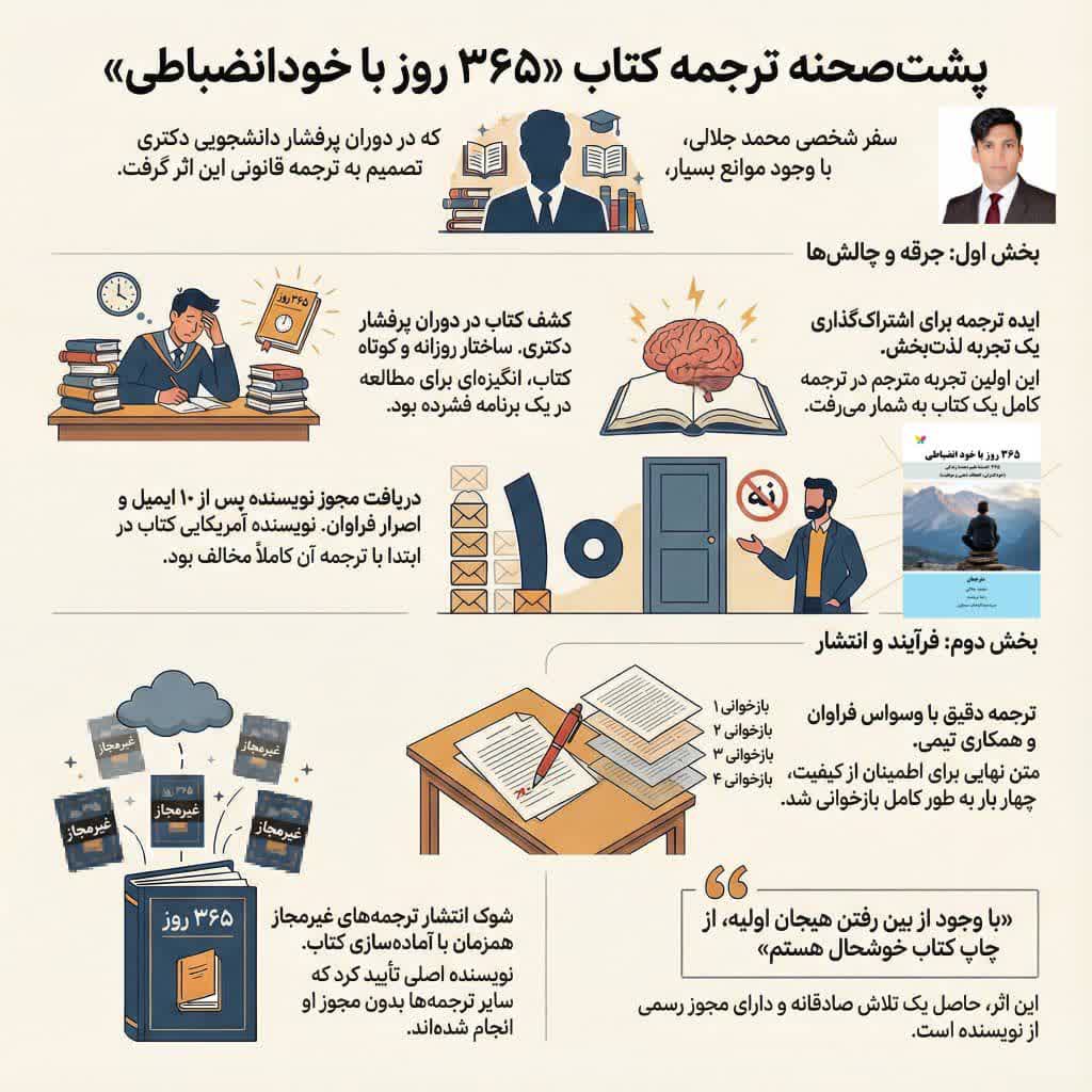 هرمزبان – دکتر محمد جلالی، مترجم ایرانی، در دوران پرتنش تحصیل دکتری، با وجود مخالفت اولیه نویسنده آمریکایی، موفق شد مجوز رسمی ترجمه کتاب «۳۶۵ روز با خودانضباطی» را دریافت کند؛ تلاشی که با تأکید بر کیفیت، بازخوانی چندباره و مقابله با ترجمههای غیرمجاز، به نمونهای از اخلاق حرفهای در نشر تبدیل شد.