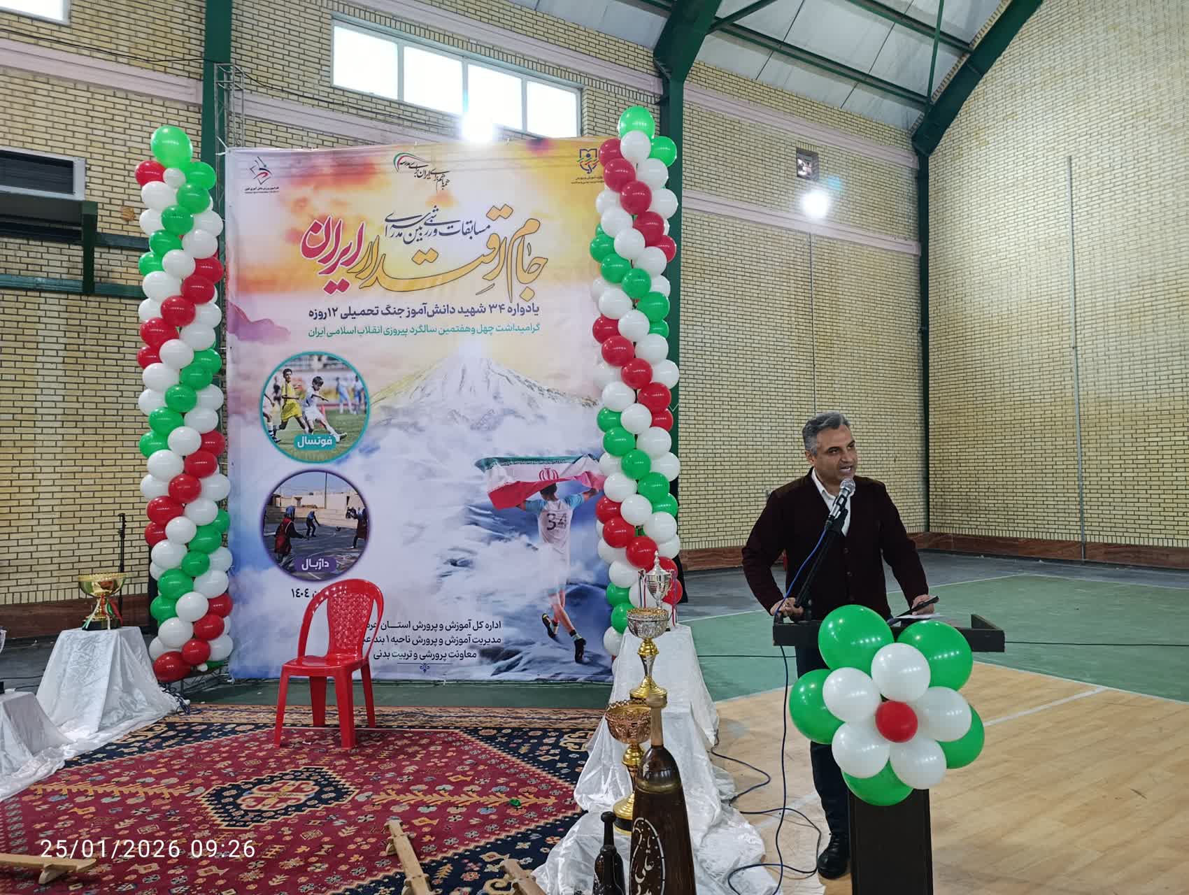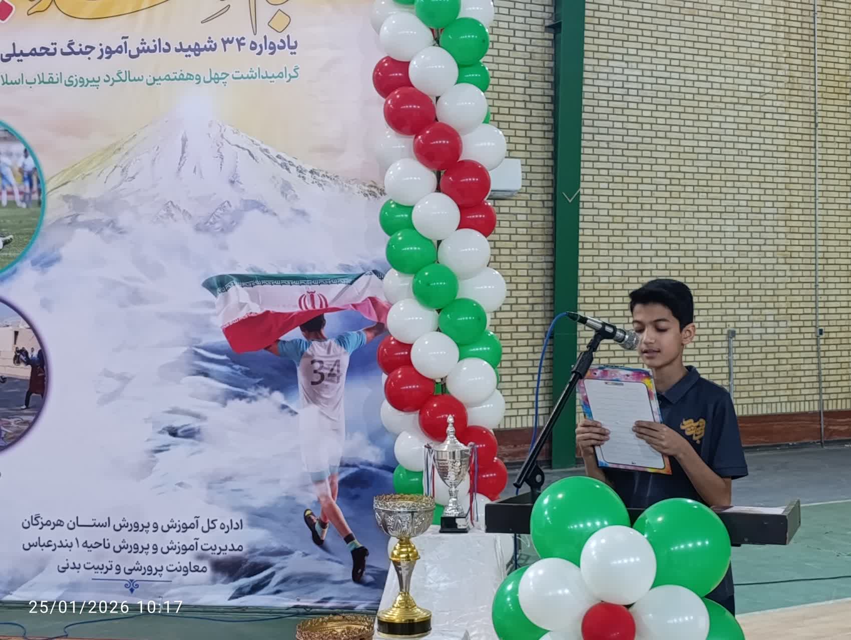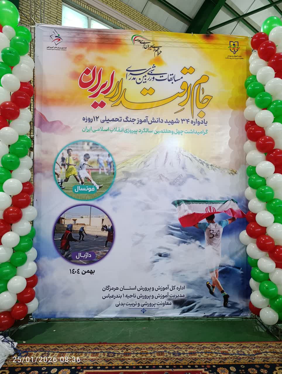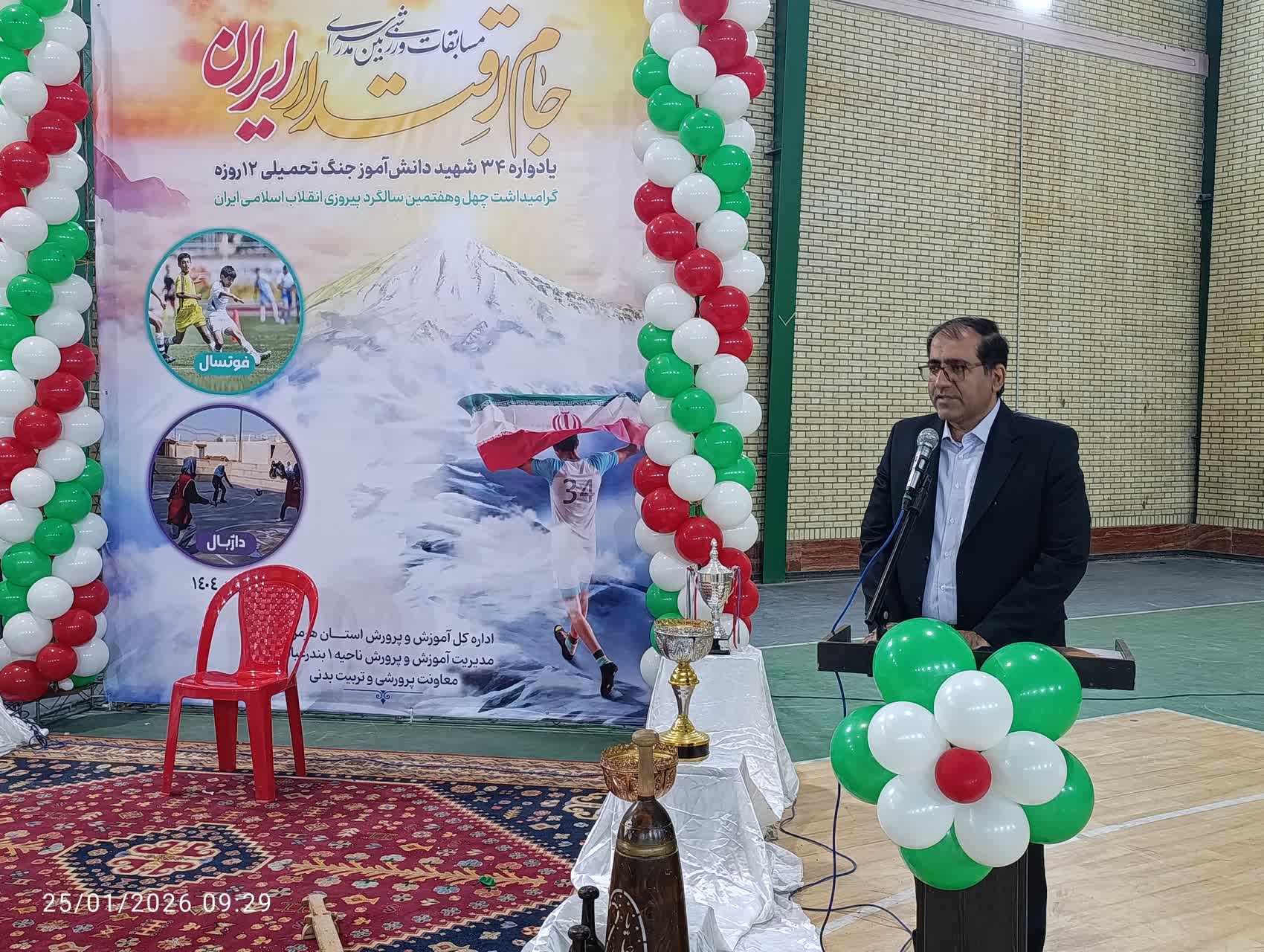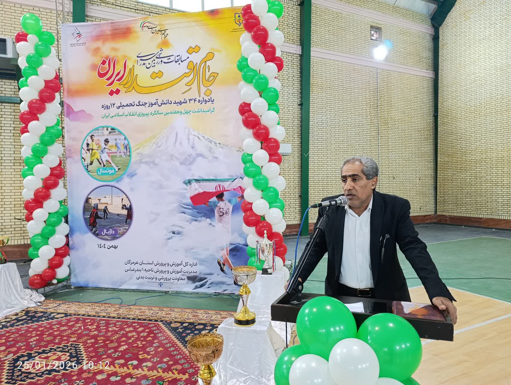 هرمزبان – آیین افتتاحیه مسابقات ورزشی «جام اقتدار ایران» یادواره ۳۴ شهید دانش‌آموز جنگ تحمیلی ۱۲ روزه و گرامیداشت چهل‌وهفتمین سالگرد پیروزی انقلاب اسلامی، با حضور مسئولان، دانش‌آموزان و فرهنگیان در آموزش و پرورش ناحیه یک بندرعباس برگزار شد. این مسابقات با هدف ترویج روحیه همدلی، نشاط و پاسداشت فرهنگ ایثار و شهادت در میان نسل نوجوان اجرا می‌شود.