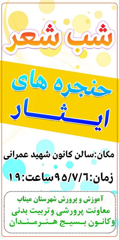 وی ابراز داشت:کانون فرهنگی تربیتی شهید عمرانی مدیریت آموزش وپرورش شهرستان میناب با همکاری کانون بسیج هنرمندان شهرستان شب شعری تحت عنوان حنجره های ایثار برگزار می کند.