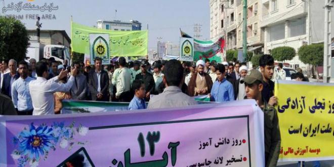 مردم همیشه در صحنه جزیره قشم امسال نیز همانند سال های گذشته همانند مردم سراسر ایران سربلند با حضور پرشور در مراسم 13 آبان و سردادن شعارهای انقلابی، انزجار خود را از سیاست های غلط کشورهای استکباری فریاد زدند.
