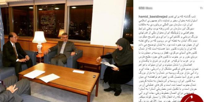 وی در پست اینستاگرام خود نوشت: شب گذشته كه براي تقديم استوارنامه بعنوان سفير و نماينده دائم جمهوري اسلامي ايران نزد سازمان بين المللي دريانوردي به ملاقات دبيركل اين سازمان در لندن رفته بودم، وقتي شرايط جغرافيايي و ژئوپلتيك ايران بعنوان يكي از قدرتهاي بزرگ دريايي و كشتيراني را براي وي تشريح ميكردم، ديدم نگاه ايشان به نقطه اي در روبرو كه در واقع نقشه اي از جهان بود خيره شده بود.