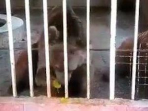 هرمزبان:یک خرس در باغ وحش خرم آباد از شدت گرسنگی، برگ خشک میخورد.