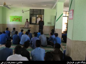 هرمزبان: حضور نخبه شهرستان ميناب در مدرسه آیت الله طالقان / حسن محمدي در جمع دانش آموزان دبیرستان آیت الله طالقانی میناب ادعا نمودند که رتبه 938 کنکور را کسب کرده و داراي بورسيه انگلستان است / عکس: محمدرضا زارعی