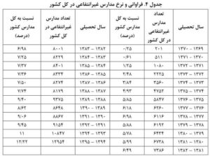 تعداد کل مدارس غیرانتفاعی در سال ۱۳۷۰، ۲۰۱ مدرسه و نسبت آن به کل مدارس کشور ۰.۲۵ درصد بوده است اما این نسبت سال به