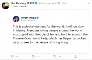 هرمزبان – سخنگوی وزارت خارجه چین در پیامی در توئیتر به پیام توئیتری اخیر سخنگوی وزارت خارجه آمریکا در انتقاد از لایحه امنیت ملی چین در هنگ‌کنگ، با طعنه به قتل مرد غیر مسلح سیاه‌پوست توسط پلیس آمریکا اشاره کرد.
